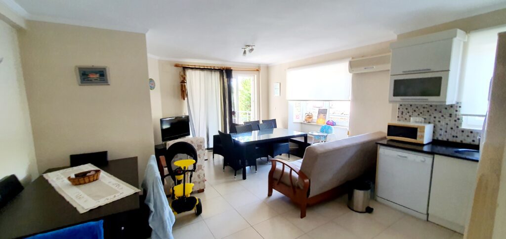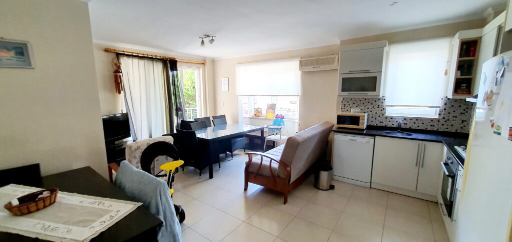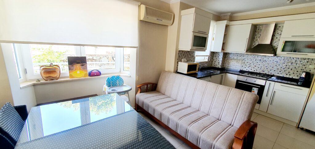 Beautiful residence in Fethiye is located 100 m from Calis beach. All white furniture, items shown in the photos are included in the price. The residence includes 2 bedrooms – 1 living room and kitchen – 2 bathrooms.