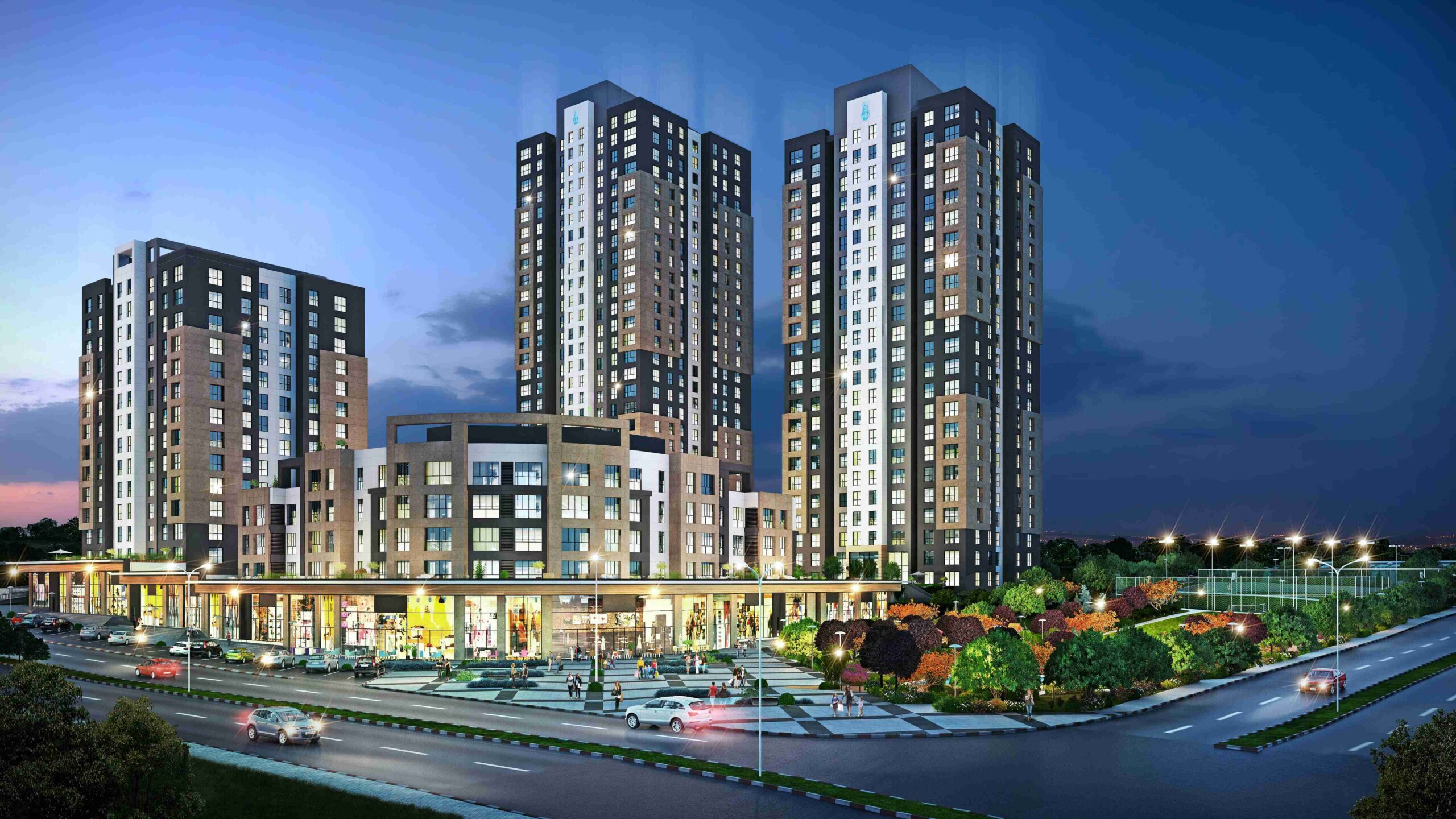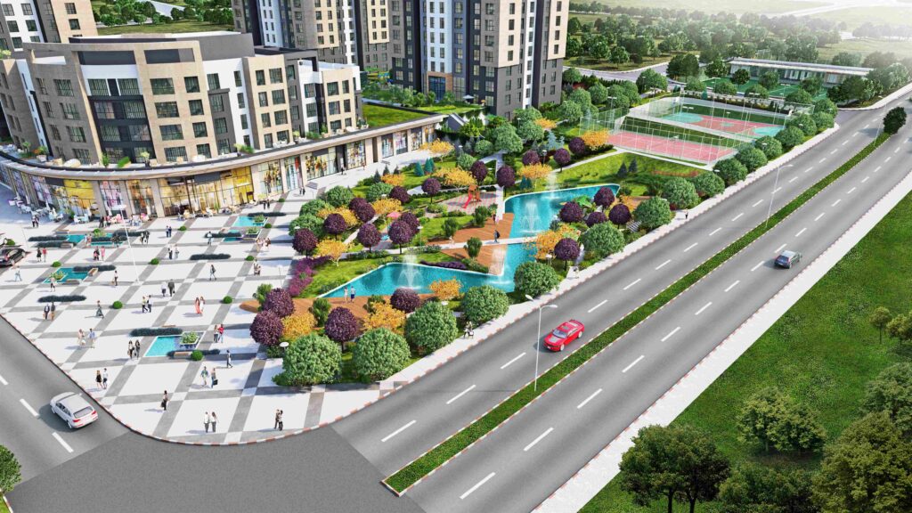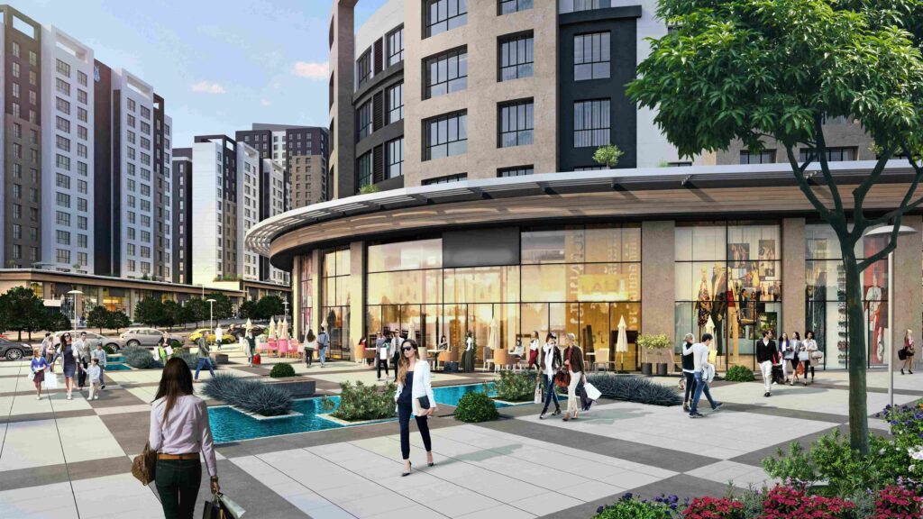 The total area of ​​the site is 41,000 square meters, 70% of which is green space, and the number of shops in the project is 52 commercial shops, surrounded around the project from the outside buildings.