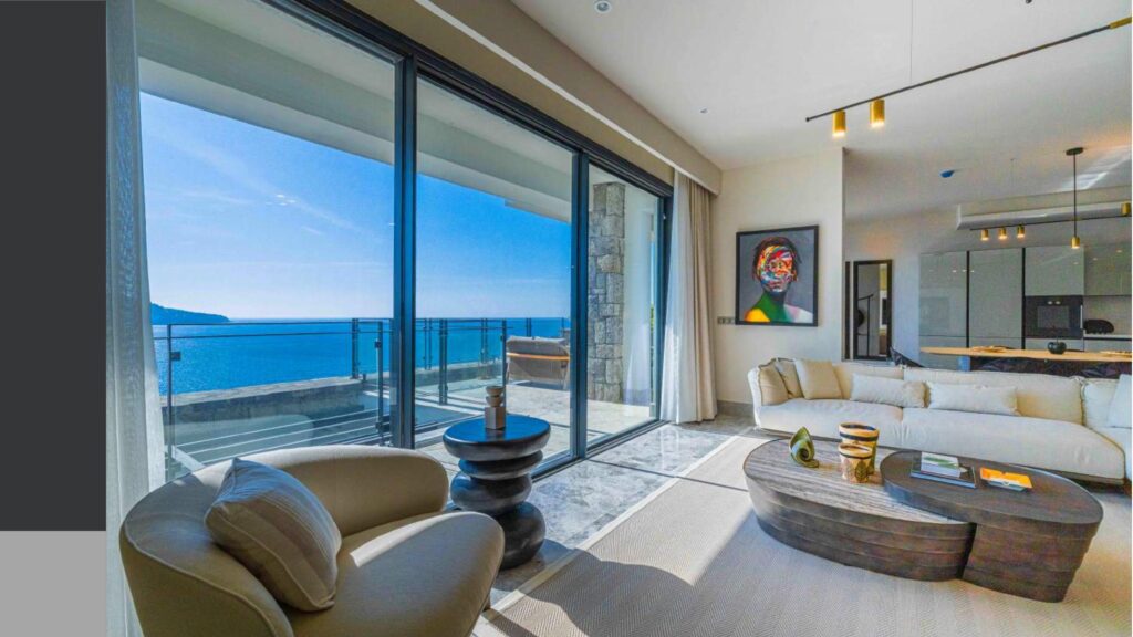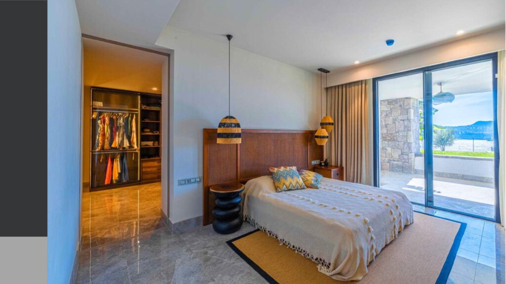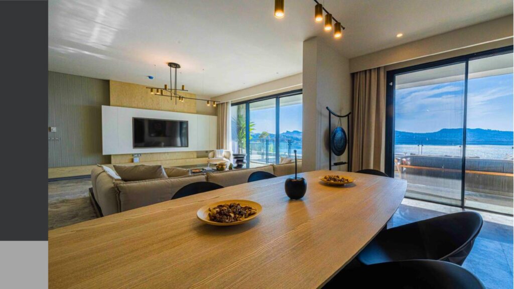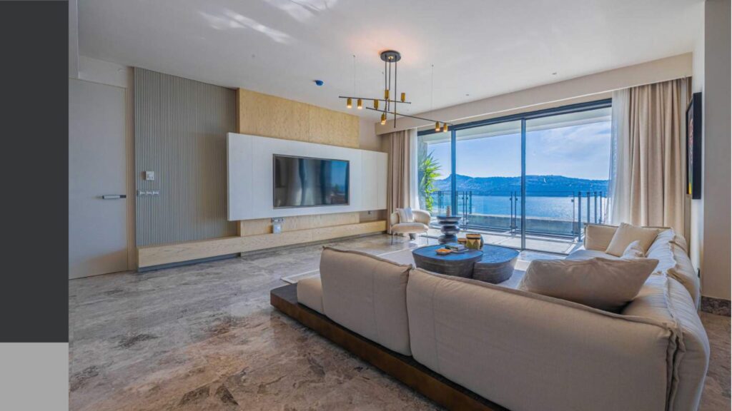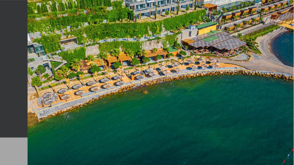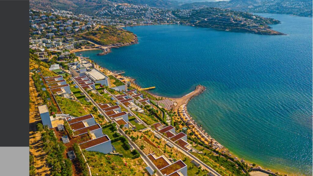 Promenade with panoramic sea views and calm sea in the bay with a private coastline of 1200 meters, consisting of 76 individual villas and 234 residences and a hotel on 150 hectares of land.