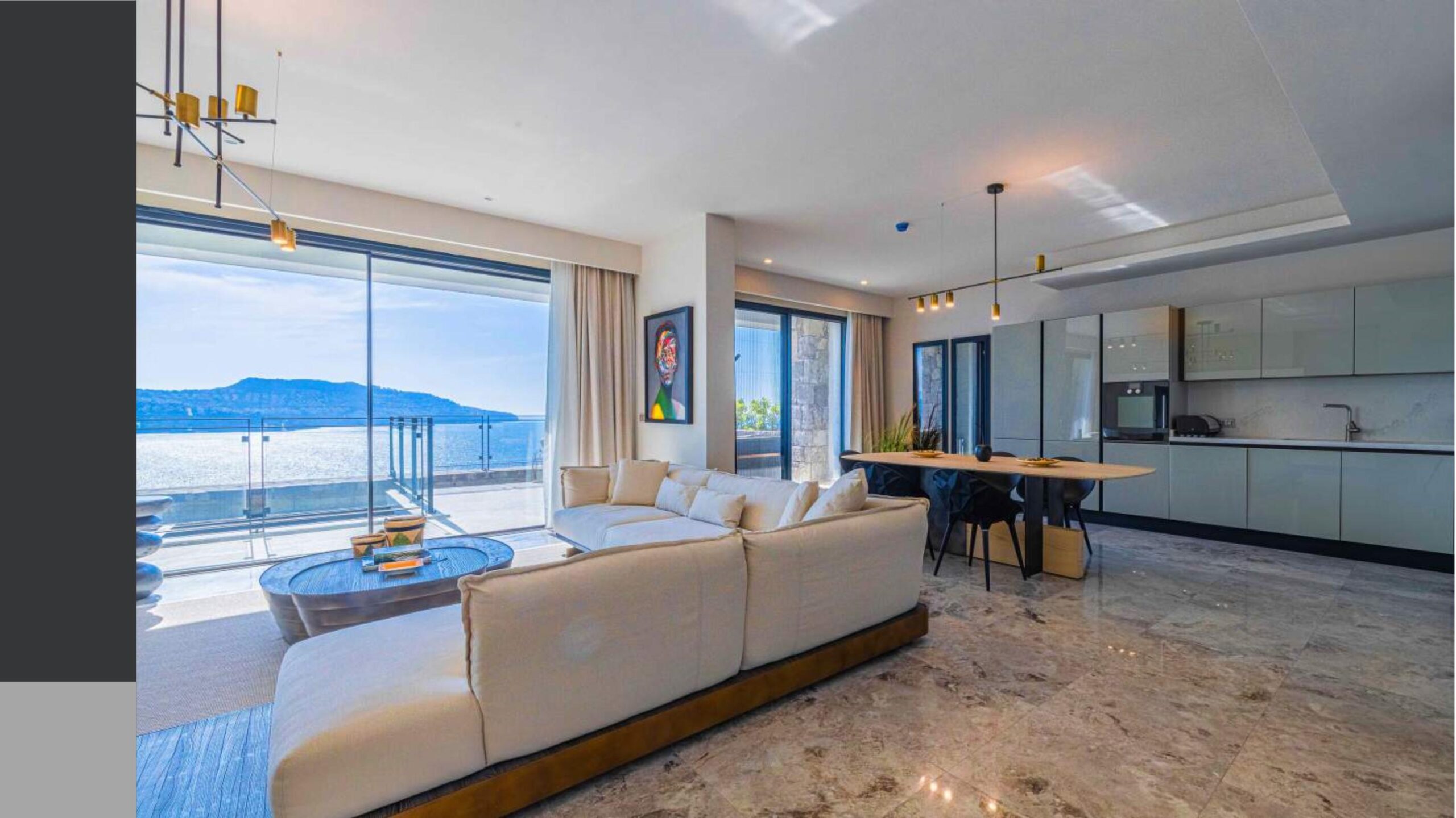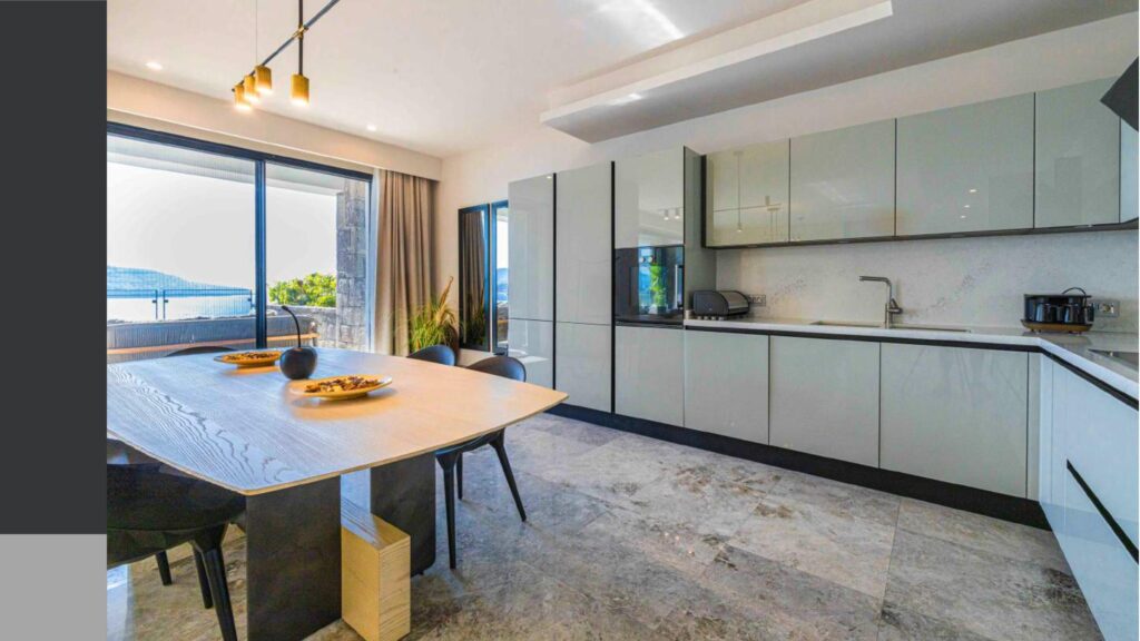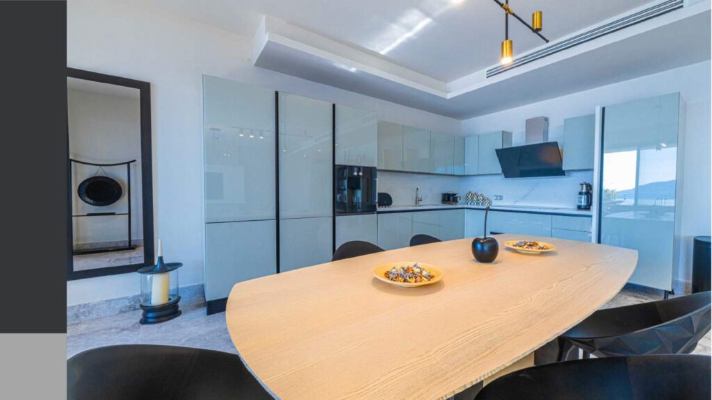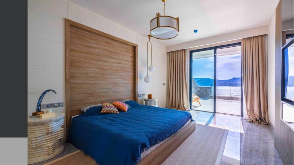 Promenade with panoramic sea views and calm sea in the bay with a private coastline of 1200 meters, consisting of 76 individual villas and 234 residences and a hotel on 150 hectares of land.