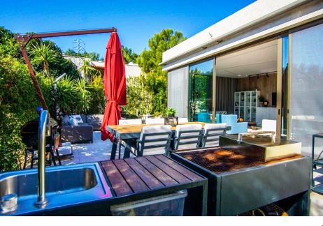 Large garden with wooden deck and terrace