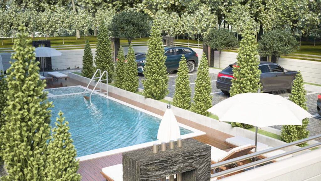 The area of the complex is 6.000 m2. The complex has an adult pool with a children’s pool, as well as a sunbathing area and parking.