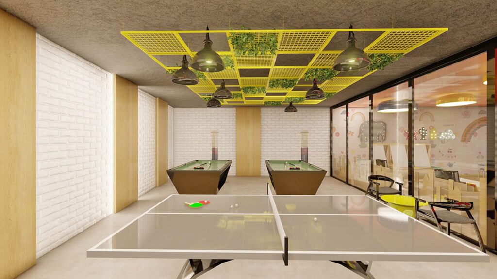 - Jardin, aire de jeux (extérieure et intérieure), salle TV