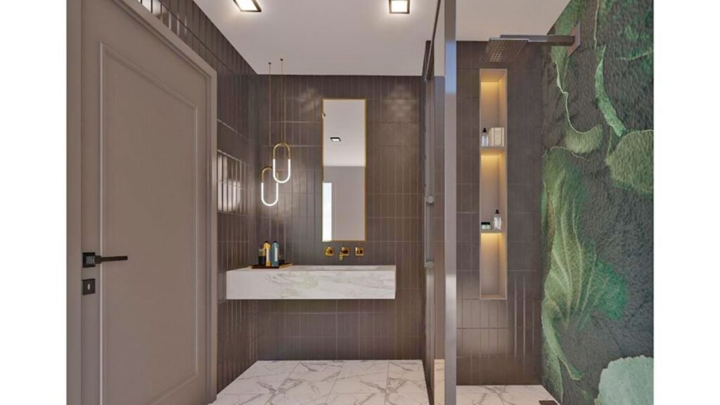 - salles de bains entièrement carrelées avec meubles