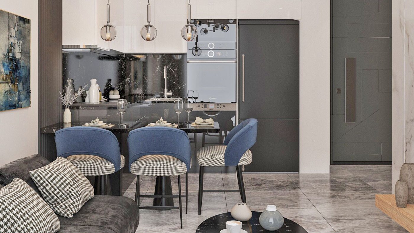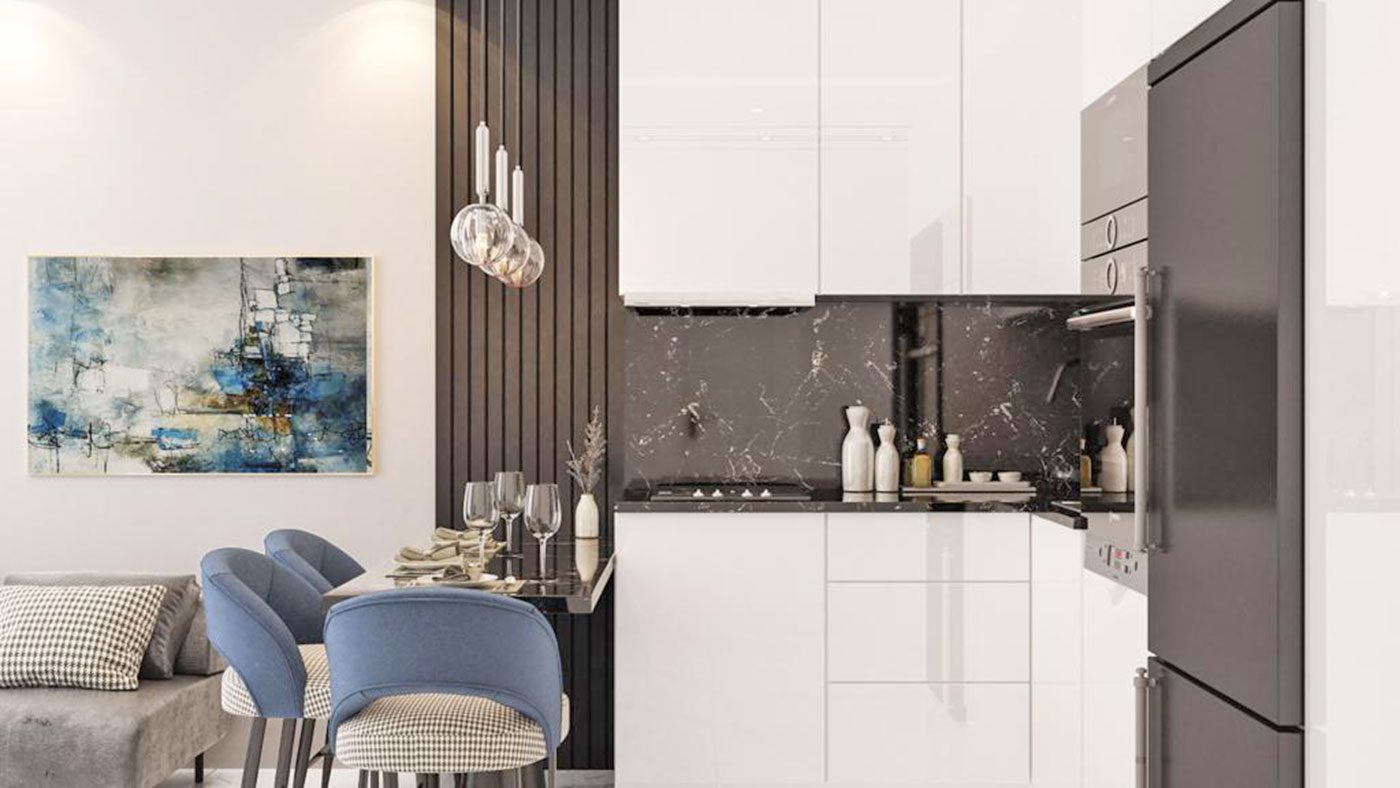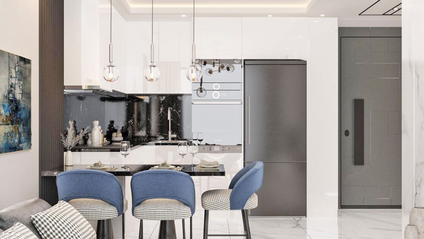 Les appartements disposent d’une porte blindée en acier, de fenêtres en PVC à double vitrage, d’une salle de bain entièrement carrelée et équipée, d’une cuisine avec armoires, d’un éclairage intégré et plus encore.