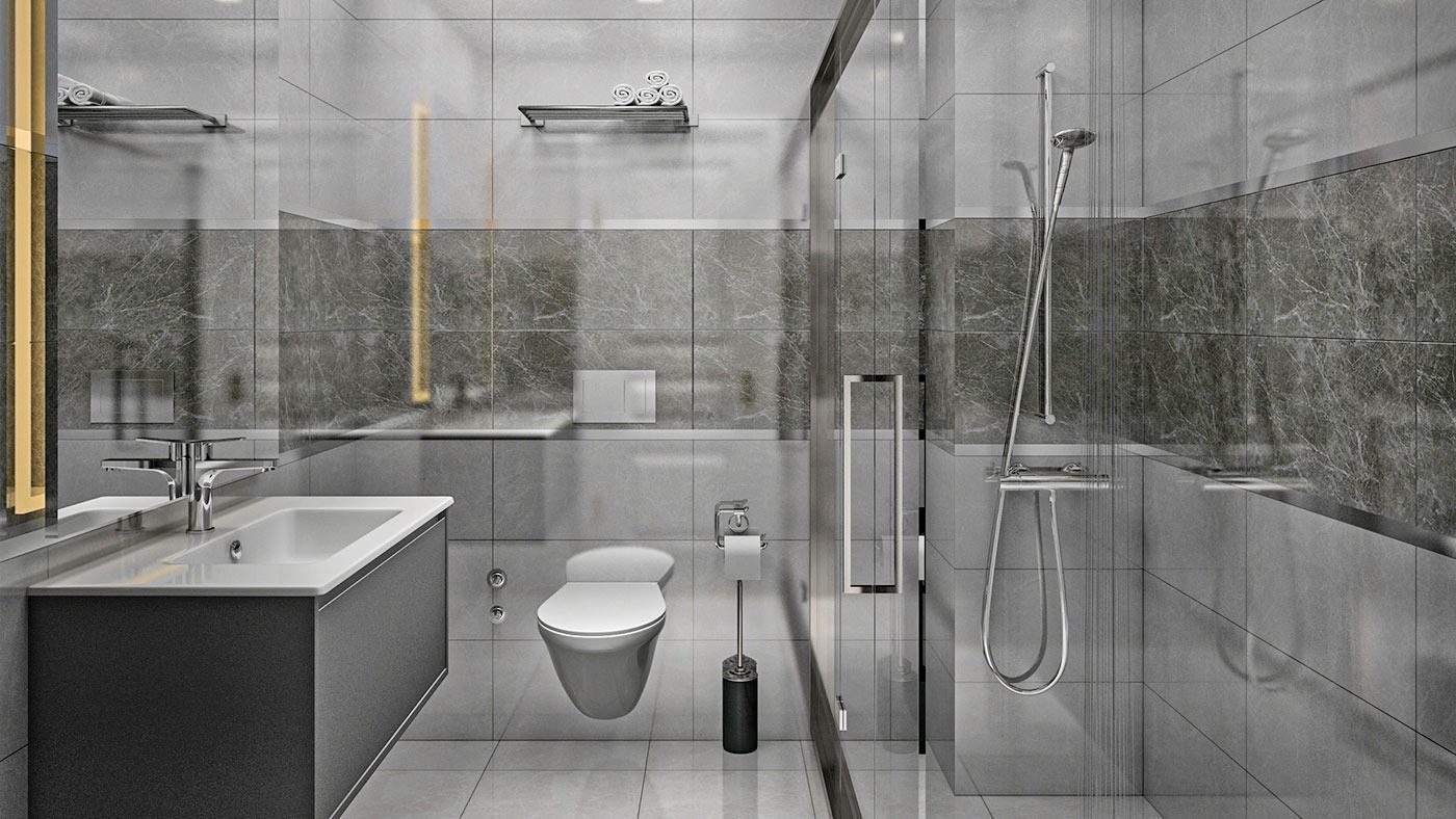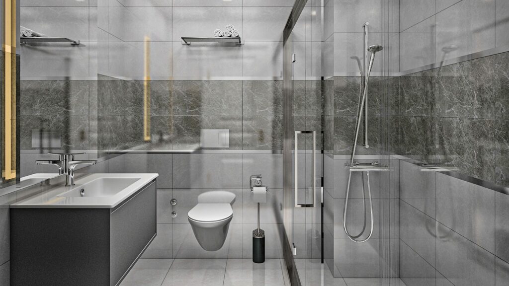 salles de bains entièrement carrelées avec meubles, douches avec verre de protection.