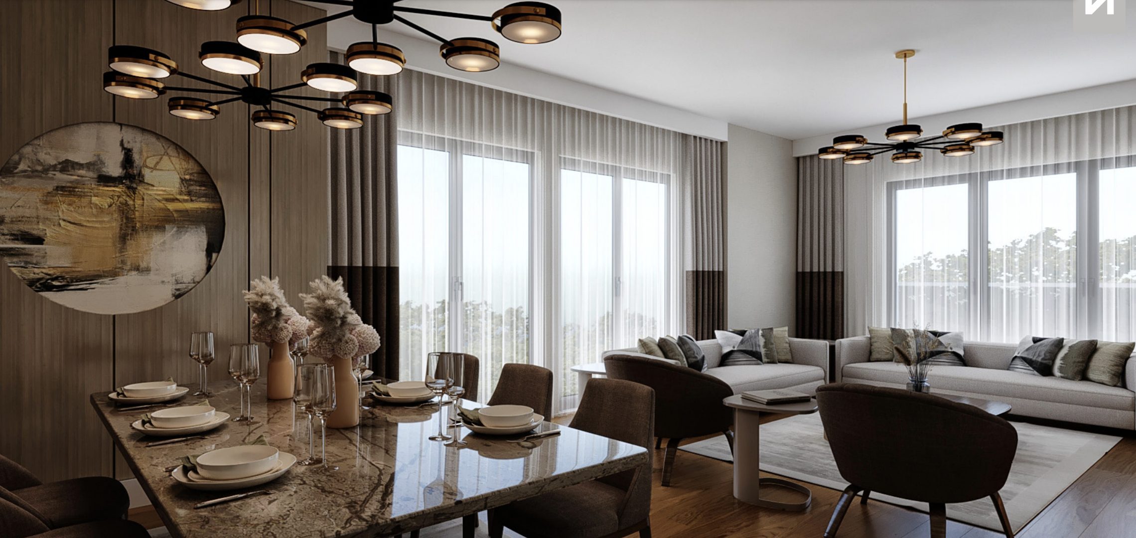De grandes fenêtres élégantes dans chaque appartement donnant sur les lumières de la ville et les paysages charmants.