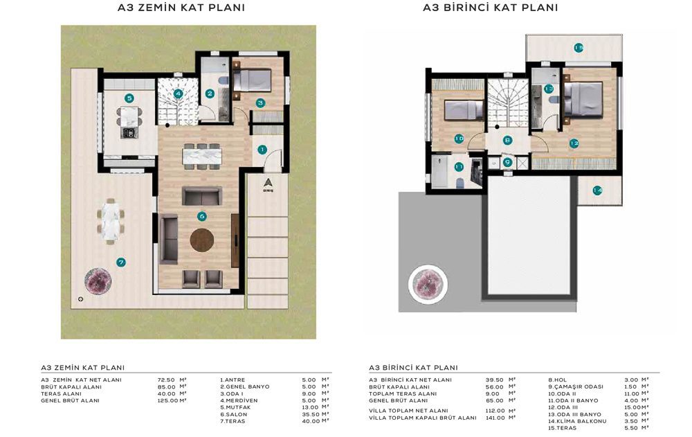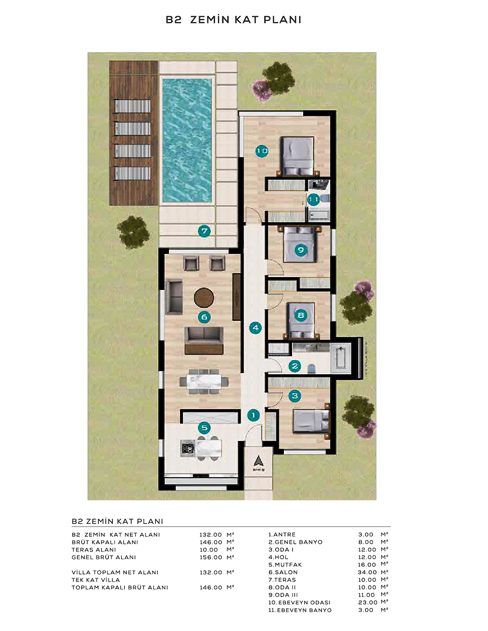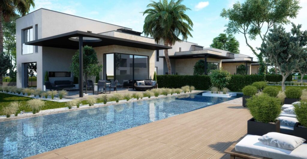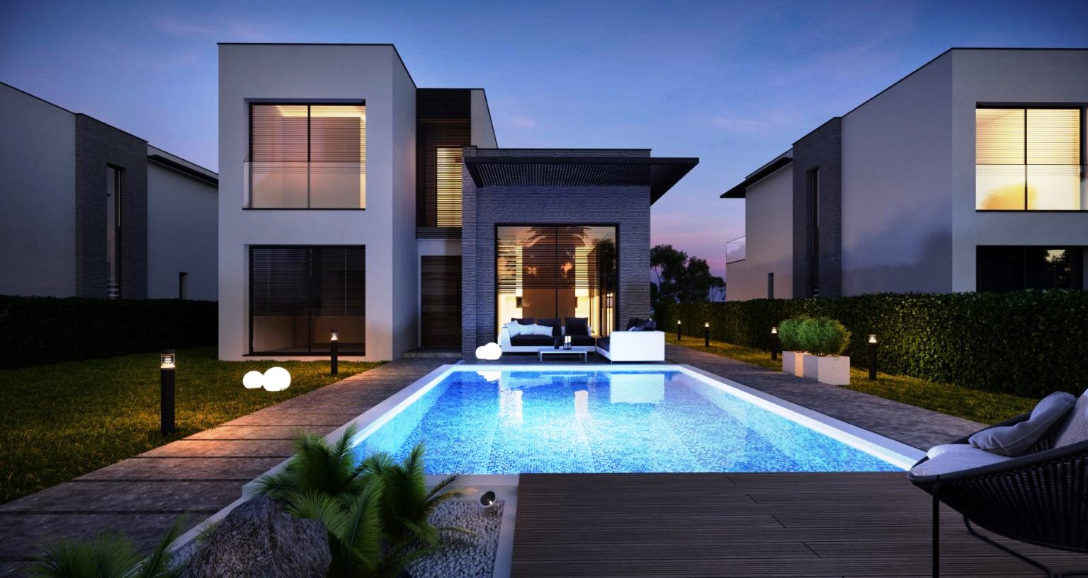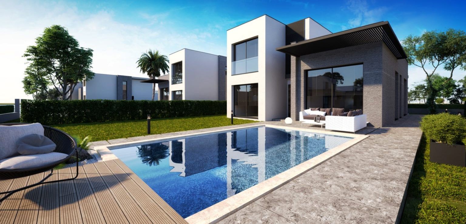 Villa 3+1, 2 étages, 141/116m2 450 000 € (8 villas partagent une piscine)