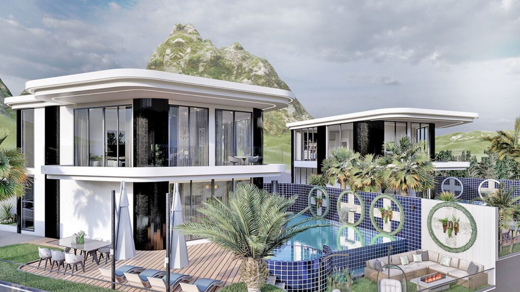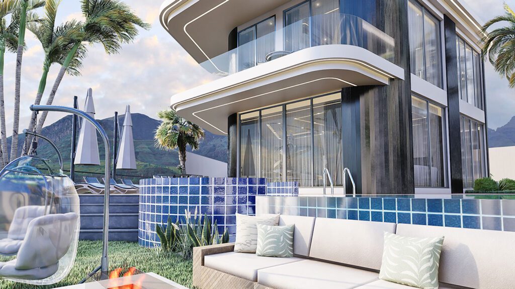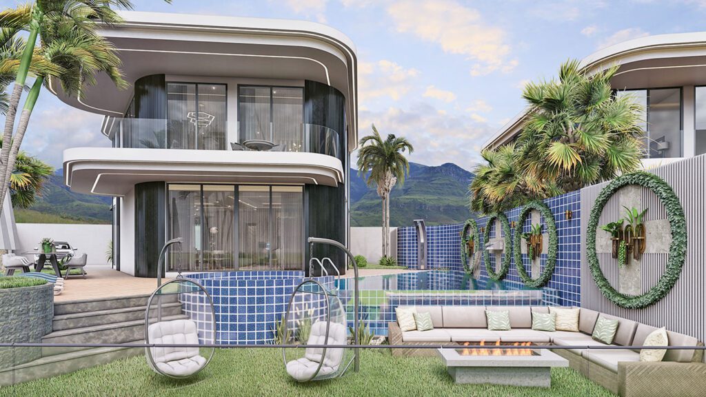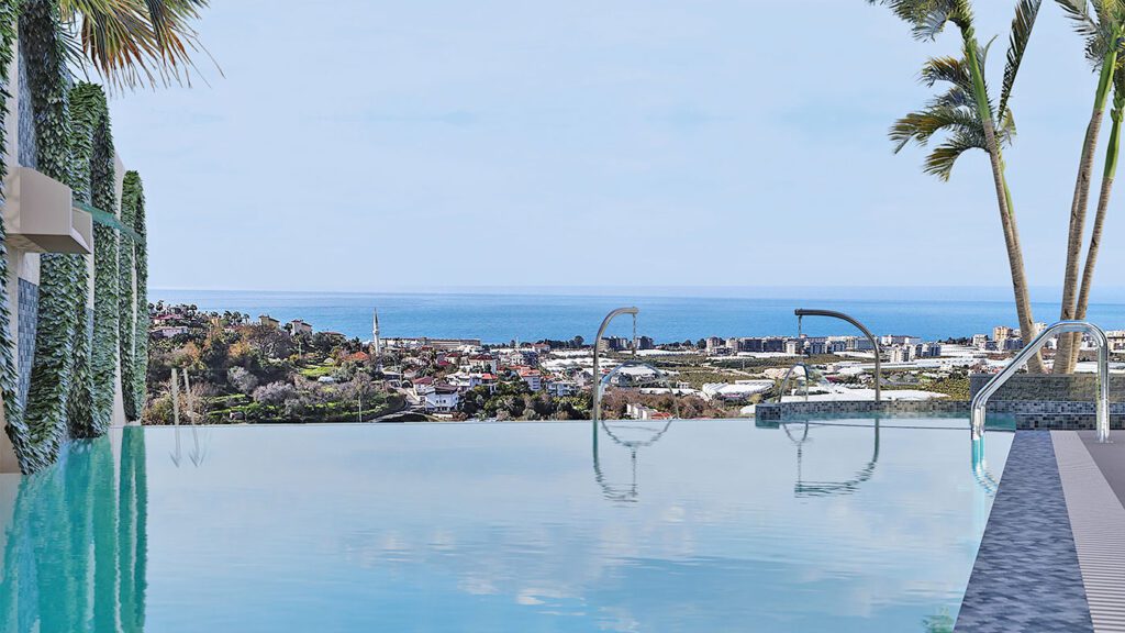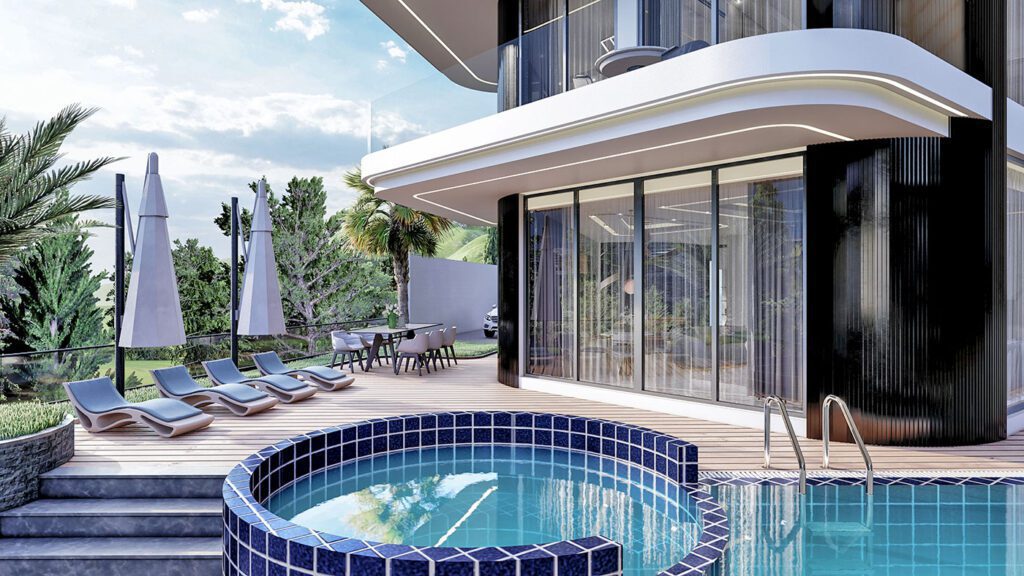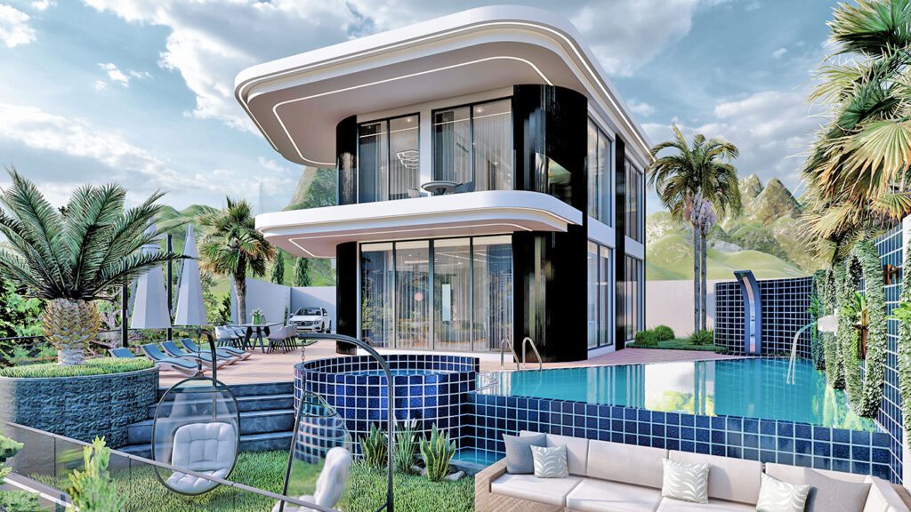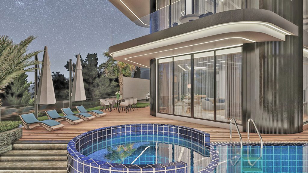 Chaque villa de luxe surplombant la mer Méditerranée et le château d’Alanya est construite sur un terrain de 445 m2 avec un jardin bien aménagé, une piscine privée (40 m2) avec un solarium et un grand parking.
