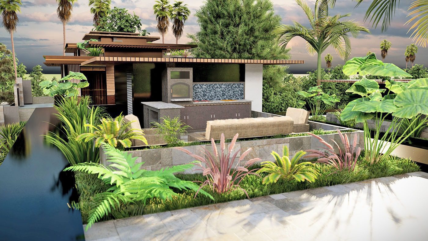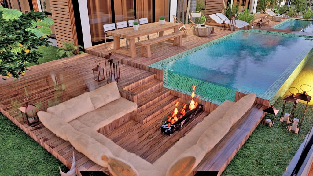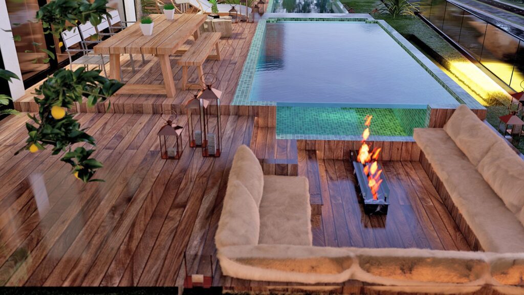– Rez-de-chaussée avec hall d’entrée, séjour, cuisine américaine, chambre, salle de bain, terrasse avec piscine et balcon.