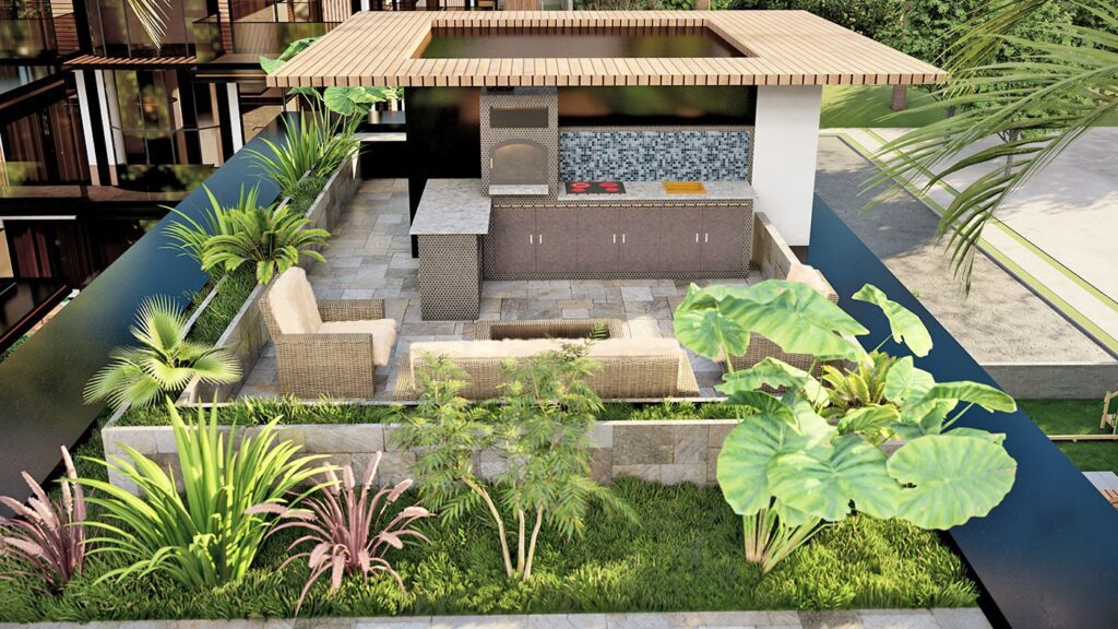 – Rez-de-chaussée avec hall d’entrée, séjour, cuisine américaine, chambre, salle de bain, terrasse avec piscine et balcon