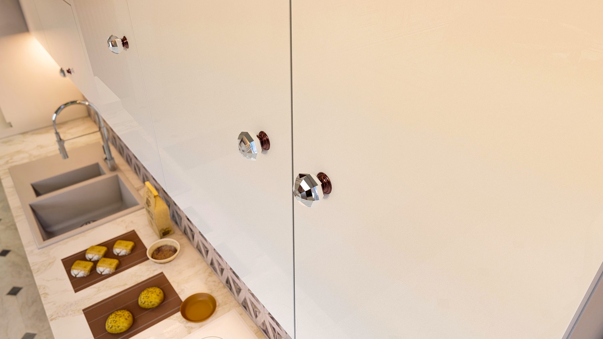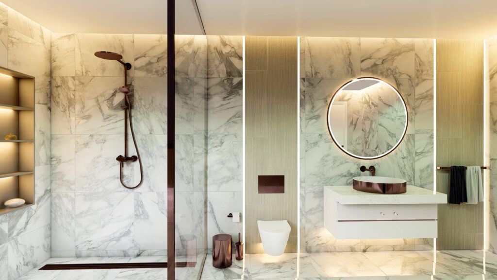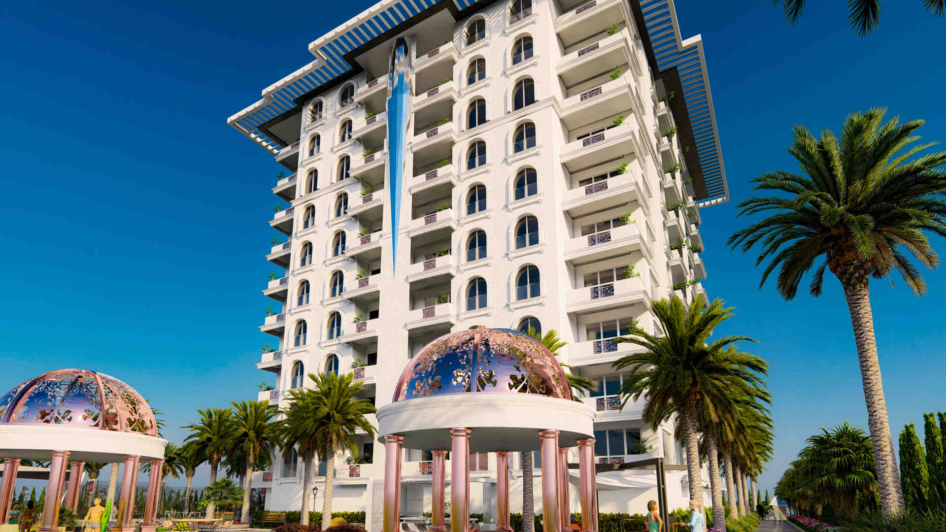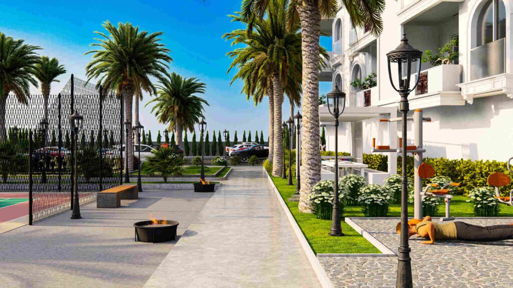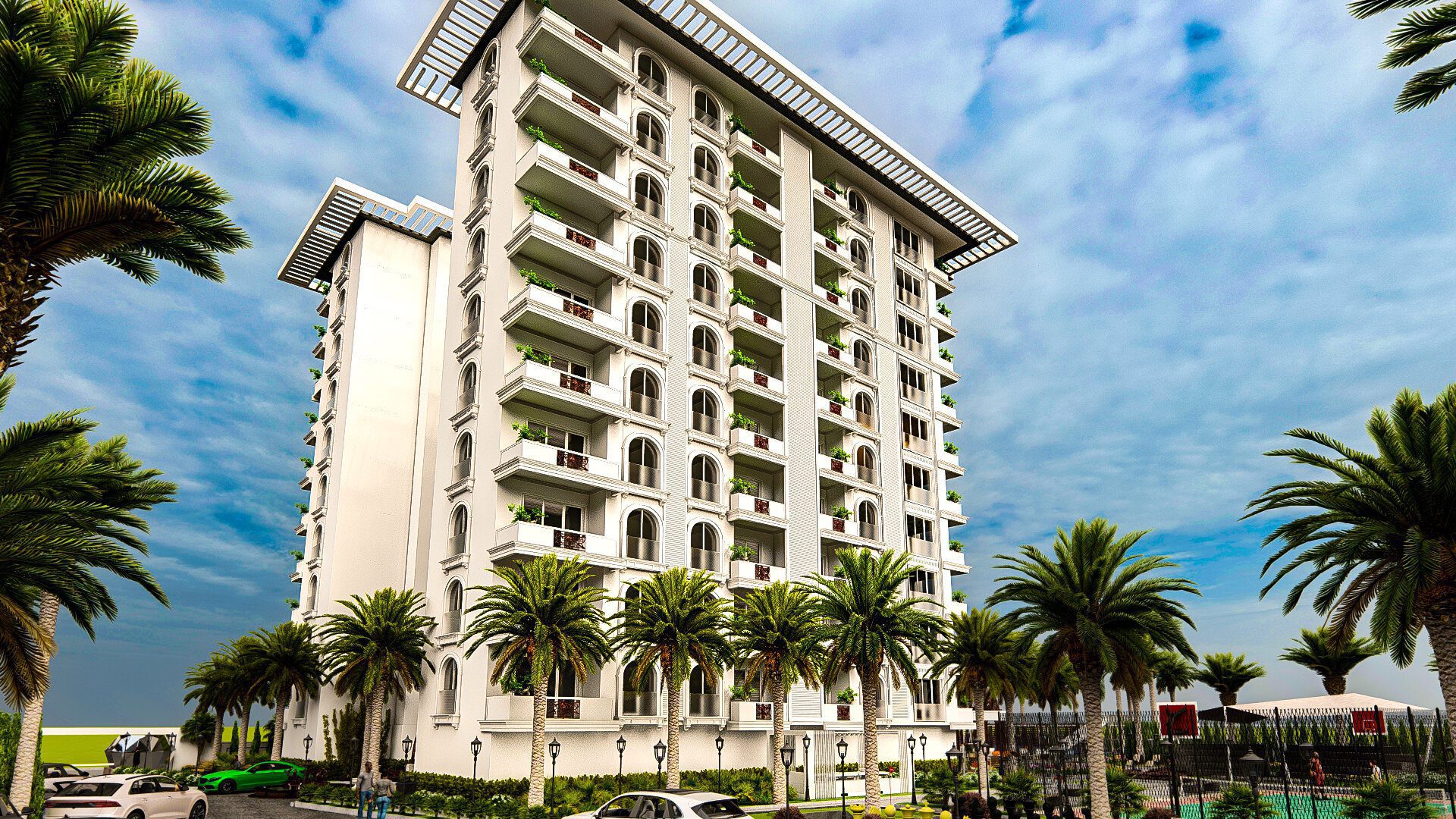 Апартаменты имеют роскошный дизайн и оснащены высококачественными материалами, такими как керамическая плитка на полу, окна с двойным остеклением, рольставни на всех окнах, раздвижные двери на балконы, встроенные точечные светильники, оборудованные кухни. с гранитными столешницами, полностью отделанные плиткой ванные комнаты с мебелью и душевыми кабинами, стальные входные двери и многое другое