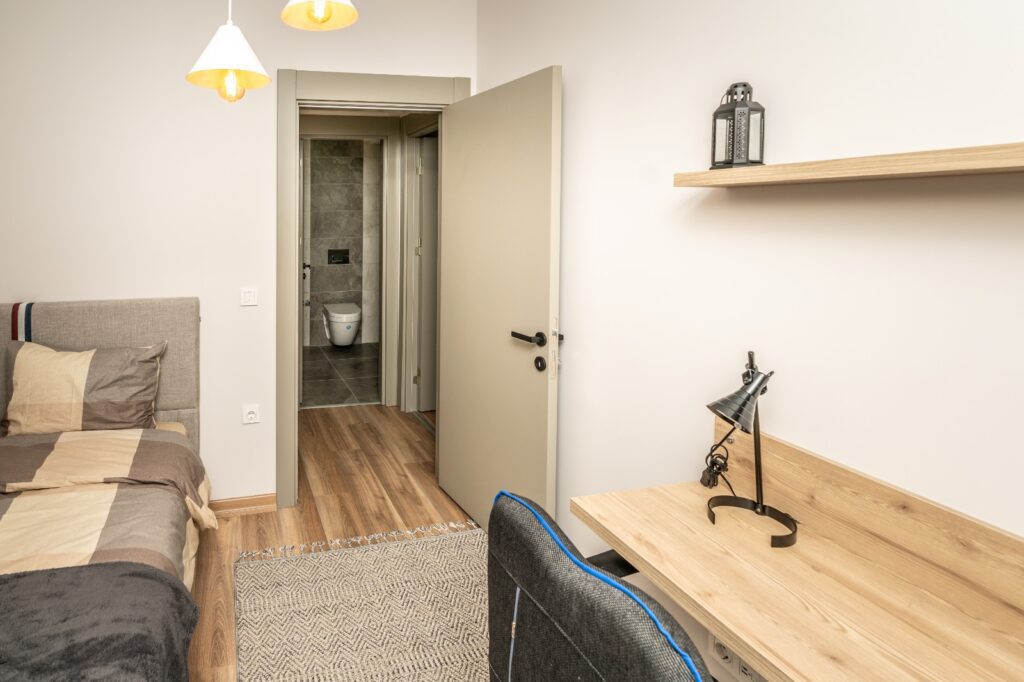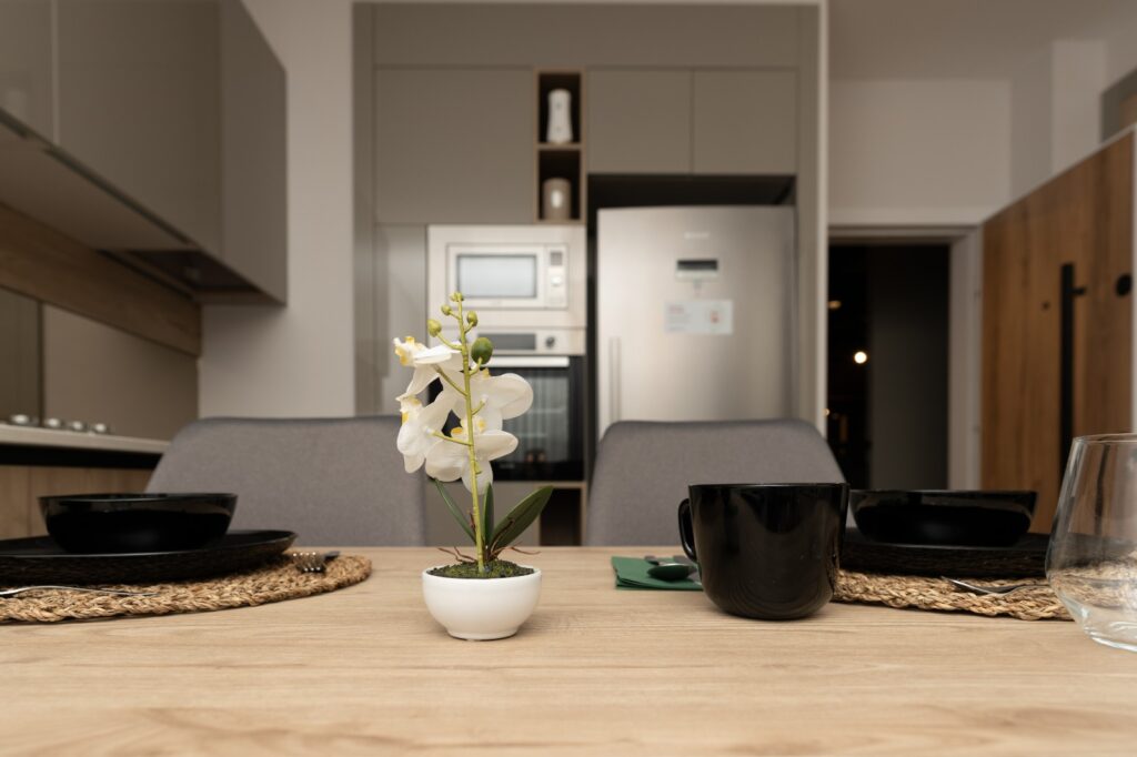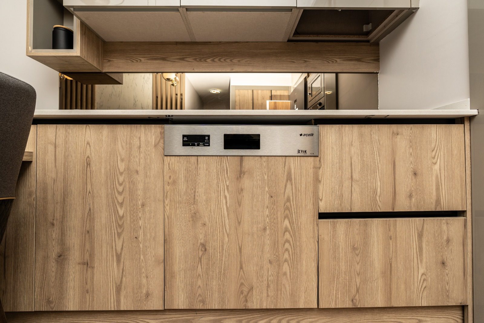 Дизайн интерьера апартаментов отличается современными и изящными линиями. Благодаря чему, при входе в квартиру вас встречает воздушная и стильная атмосфера. Кухня открытой планировки гармонично интегрирована с гостиной, которая позволяет домовладельцам развлекать своих гостей во время приготовления еды или закусок. Кухни оборудованы шкафами с плоским экраном и бытовой техникой известных брендов. В ванных комнатах есть душевая кабина со стеклянной перегородкой, деревянный туалетный столик с раковиной, акцентное зеркало и настенные стеллажи.