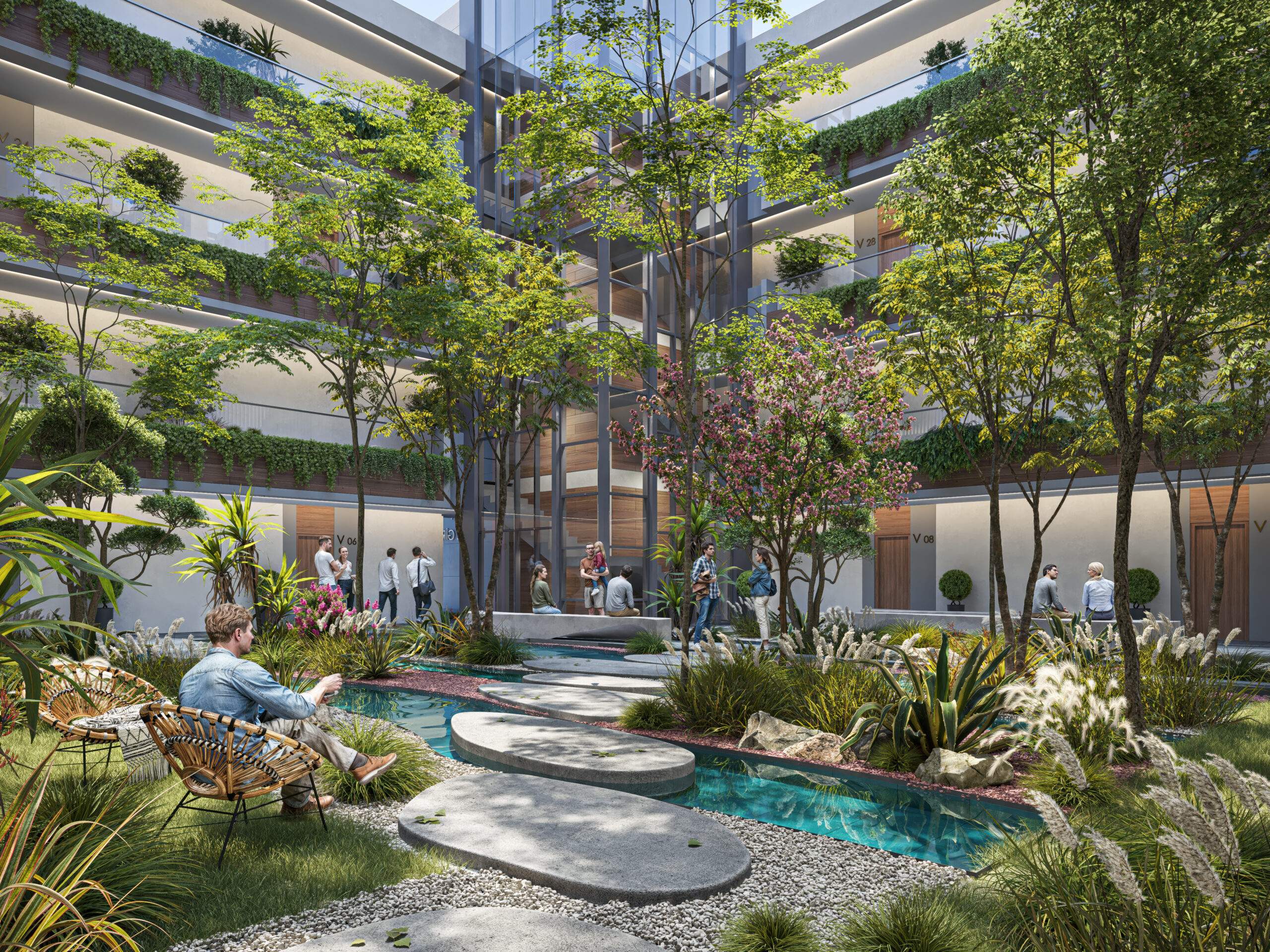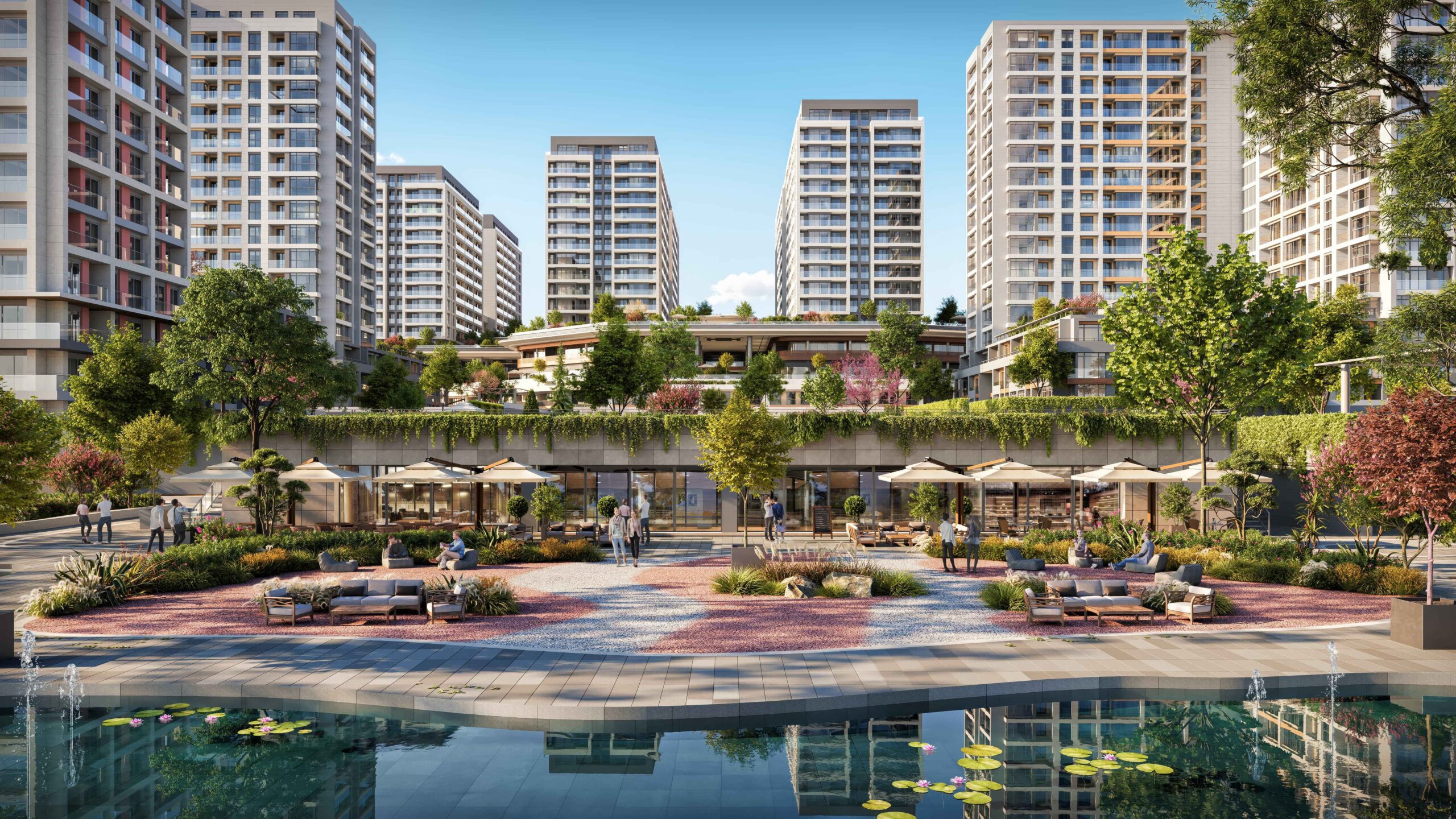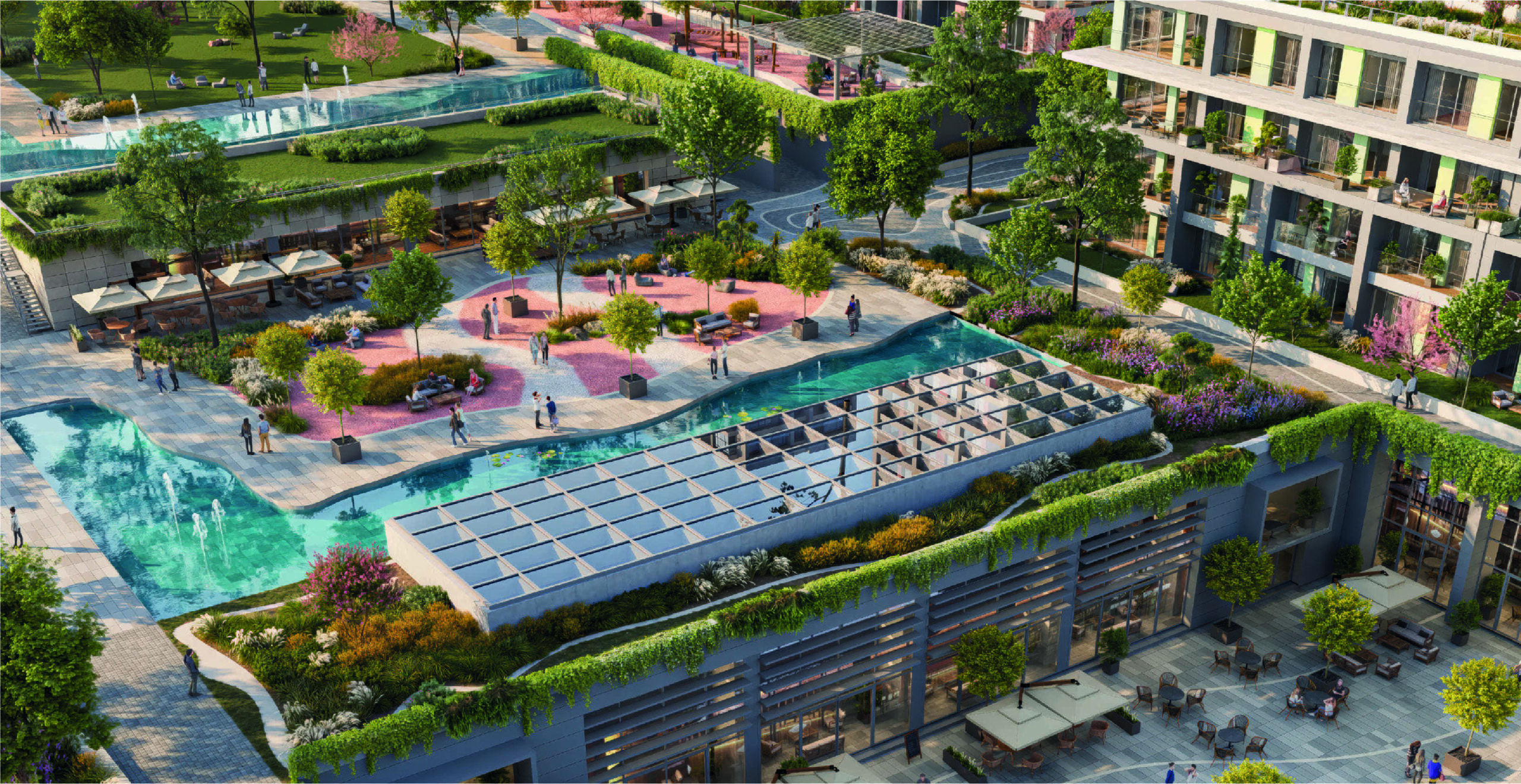- Зеленая зона площадью 45 000 м2 с ландшафтными бассейнами