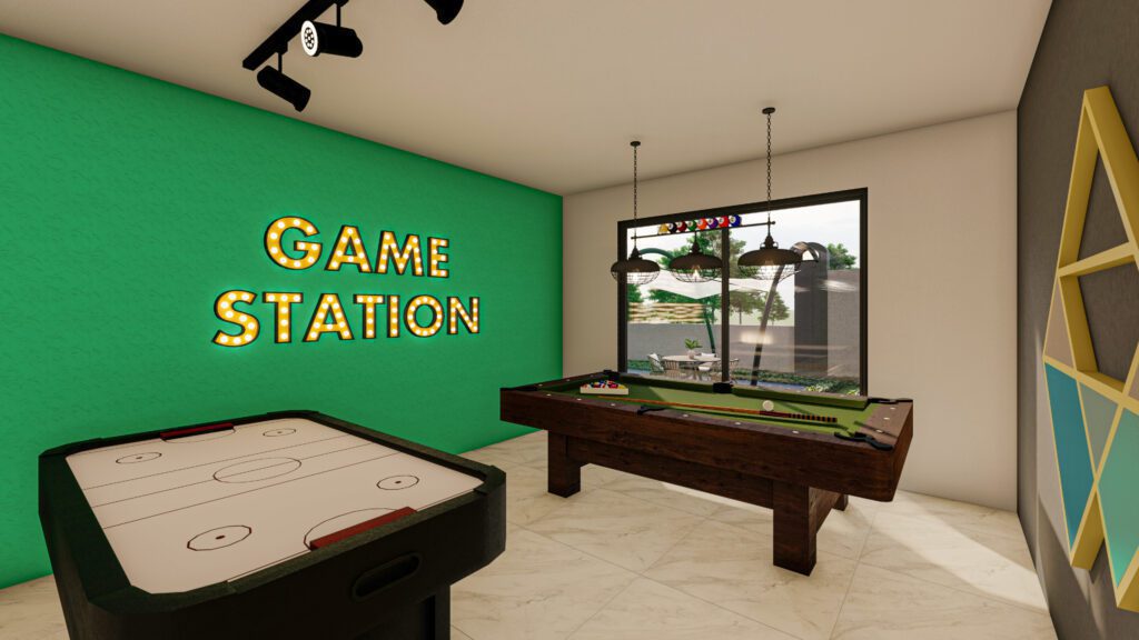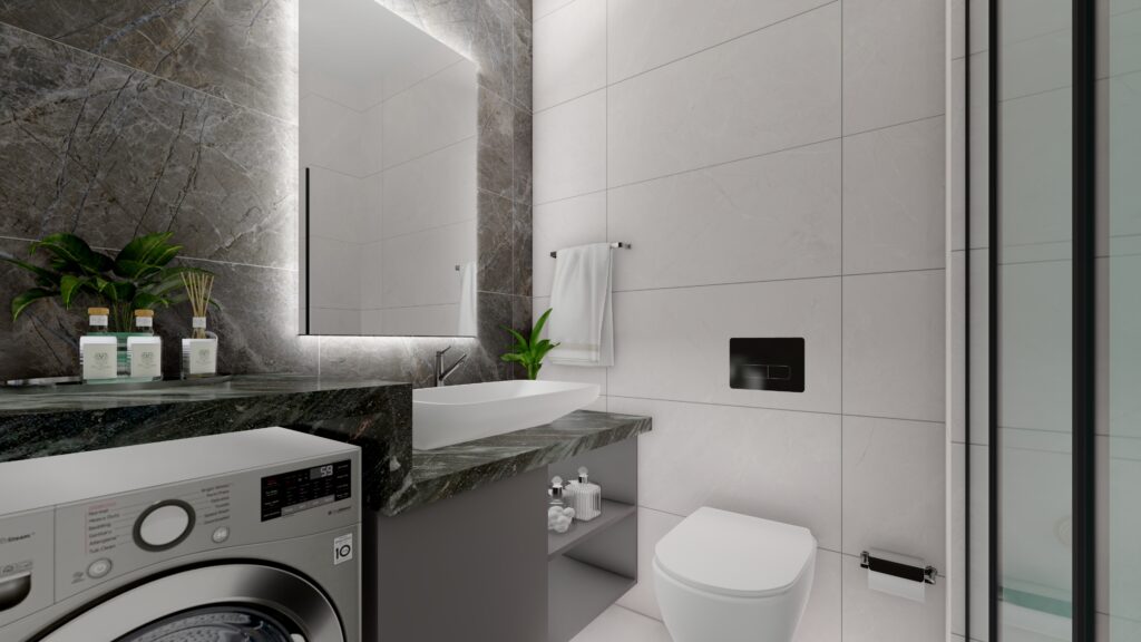 - полностью выложенные плиткой ванные комнаты с мебелью и душевыми кабинами